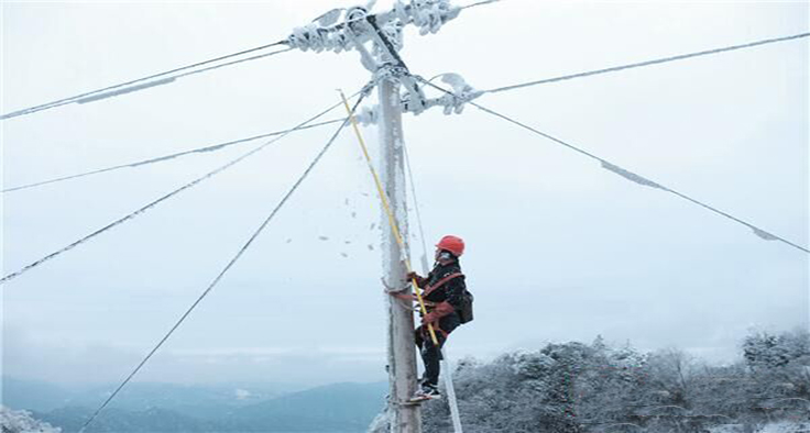 2018年12月31日上午10時(shí),國(guó)網(wǎng)芷江供電公司工作人員在海拔1008米的明山頂峰進(jìn)行上桿除冰作業(yè)。連日來(lái),為保障人民群眾生產(chǎn)生活用電,該公司派出精干力量巡視129人次,特巡線路28條次,排除險(xiǎn)情47處。(郭志剛 龔衛(wèi)國(guó) 攝)