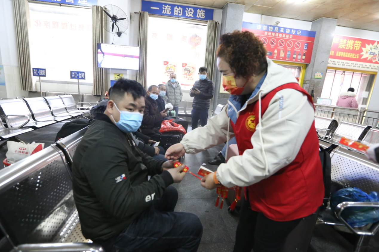 志愿者為春運首天首批幸運旅客送上專屬福袋和祝福。隨后,志愿者一起為候車大廳掛燈籠、貼福字,為旅客營造濃厚的節(jié)日氛圍,并圍繞重點旅客開展搬運行李、票務(wù)協(xié)助等志愿服務(wù),做好疫情防控、安全生產(chǎn)等宣傳。(洪江區(qū)春運辦)