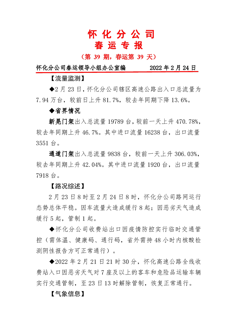 2022年高速懷化分公司第39期春運(yùn)專報