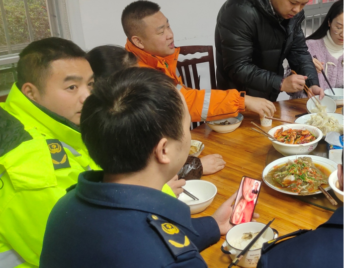 17時(shí),訓(xùn)練剛剛結(jié)束,食堂里就飄來了飯菜香,隊(duì)員們才想起:“今天是年夜飯加餐啊,趕緊去洗澡!”隊(duì)員們脫去作訓(xùn)服,豆大的汗珠還掛在額頭就往宿舍跑去。不一會(huì)兒,管理所里的同事紛紛來到食堂,圍坐在一起。第一件事竟然是不約而同地拿出手機(jī),有拍照發(fā)朋友圈的,更多是與家人視頻通話。